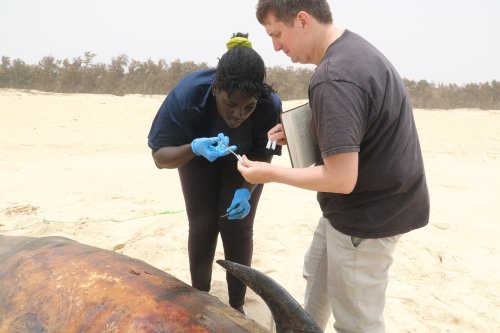 Periodic monitoring of beaches and coastlines is a relatively inexpensive and easy way to assess marine mammals and sea turtles compared to aerial surveys or monitoring by ships. By collecting stranding information throughout the year over multiple years, we are able to estimate of trends in mortality by species, season, and cause (fisheries bycatch, offshore gas exploration, natural, etc.). It’s also a way to assess temporal trends of biodiversity of cetaceans and marine turtles, to detect any unusual mortality events (UMEs), and to estimate the impact of human activities in real time in Senegalese waters. With this information, we can work towards better regulation and strict control of the national legislation and international conventions to limit the mortality of cetaceans and sea turtles.