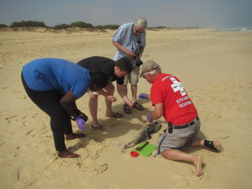 All stranded marine mammals and sea turtles are documented and sampled for genetics and other biological studies. Carcasses are examined for signs of fisheries interactions or other human-caused mortality, and if found, these cases are thoroughly documented with samples of fishery gear collected, if available. We’re also developing a coastal network of fishermen, national parks and marine protected area staff, conservation professionals, and volunteers to report marine mammal and sea turtle sightings and strandings throughout the year, so that the mortality of protected species can be accurately documented, and samples can be collected more quickly and effectively once animals strand. Access to fresher carcasses also increases the likelihood that their causes of death may be able to be determined. All stranding data is analyzed by species, locality, season, and cause of mortality to detect potential trends in stranding occurrence. Additionally, we lead education programs in local communities to raise awareness of the protected status and threats to marine mammals and sea turtles.